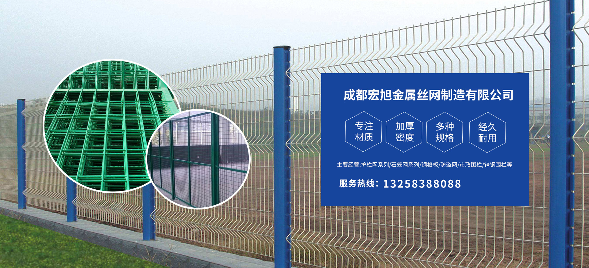 成都宏旭金屬絲網(wǎng)制造有限公司主營護欄網(wǎng)系列、石籠網(wǎng)系列、鋼格板、防盜網(wǎng)、市政圍欄、鋅鋼圍欄、鋼筋網(wǎng)片、聲屏障系列、波形護欄板、柔性纜索護欄、SNS邊坡防護網(wǎng)等其他絲網(wǎng)類產(chǎn)品。特殊規(guī)格可加工定做,也可根據(jù)客戶來圖來樣定做。自創(chuàng)業(yè)以來,公司一直堅持市場為導向,以客戶為根本,以實業(yè)為基礎,以技術(shù)為支持,以科研為后盾,集科研、生產(chǎn)、經(jīng)營為一體,不斷研制開發(fā)新產(chǎn)品,開拓市場,走綜合發(fā)展之路。多年來,公司憑借過硬的質(zhì)量,良好的信譽、優(yōu)質(zhì)的服務、合理的價格,贏得了市場和商家的一致好評。